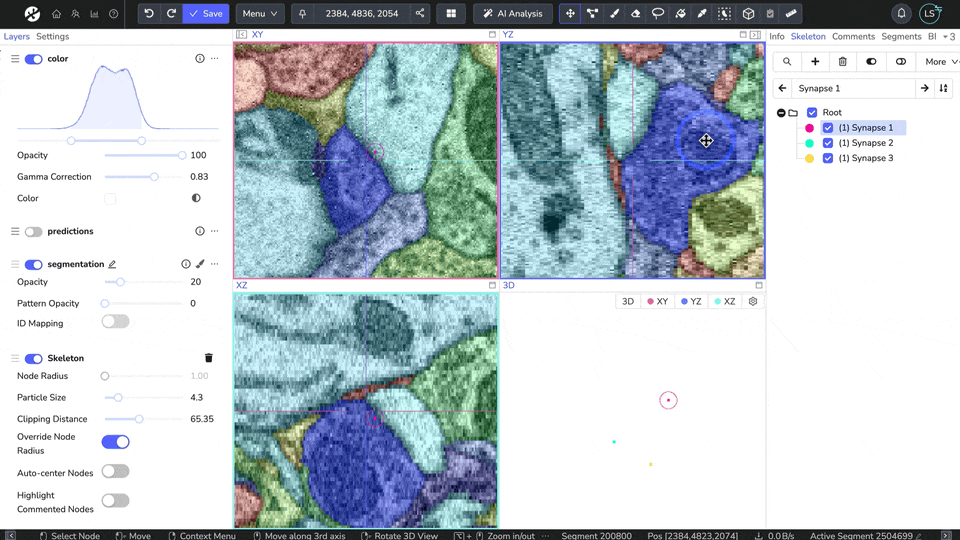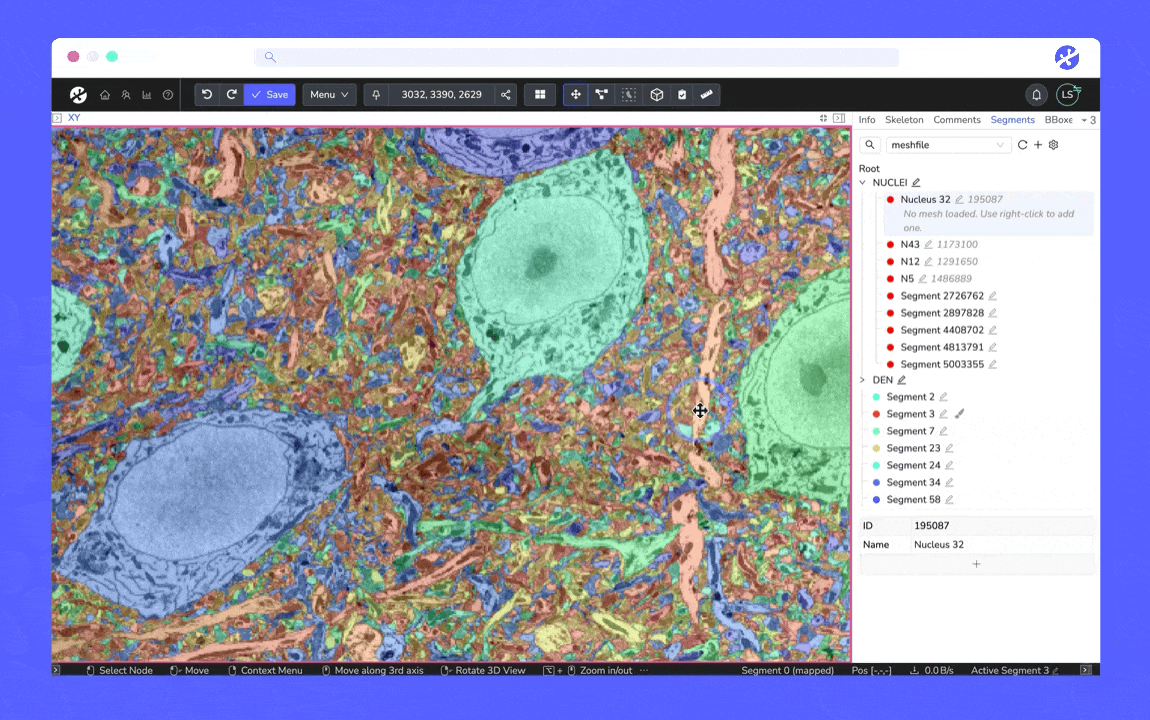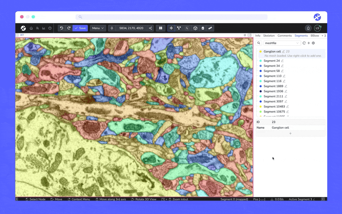 The quick-select tool now works in 3D! Simply set the prediction depth, quick-select a cell, and WEBKNOSSOS will automatically segment across the selected number of sections. Plus, instead of drawing a rectangle around the cell, you can now segment it with just a click. Read the article to learn more or watch this short tutorial video.